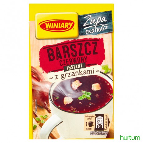 Barszcz czerwony instant z grzankami to pyszna, rozgrzewająca zupa. To uwielbiany przez Polaków smak tradycyjnej zupy podawanej nie tylko od Święta. Barszcz czerwony instant od Winiary to pyszny pomysł na przekąskę w zabieganym dniu! Wsyp zawartość saszetki do kubka, zalej gorącą wodą, dokładnie wymieszaj, poczekaj 3-4 minuty i gotowe! Spróbuj także innych zup instant od Winiary, o dobrze nam znanych tradycyjnych smakach: pomidorowa, rosół z kury, grochowa, pieczarkowa czy żurek.