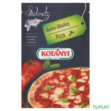 Przyrządzenie: Wymieszać mąkę z solą i oliwą. Drożdże rozpuścić w ciepłym mleku, dodać do mąki i zagnieść gładkie ciasto. Podzielić na 2 części i odstawić na około 1 godzinę do wyrośnięcia. Pomidory zagotować z solą, pieprzem, oregano i octem balsamicznym do uzyskania konsystencji kremu. Ciasto rozwałkować, posmarować przygotowanym sosem, na wierzchu ułożyć pokrojoną w plastry mozzarellę i całość posypać Pizzą Kotányi. Piec w piekarniku rozgrzanym do 220°C około 6-8 minut.