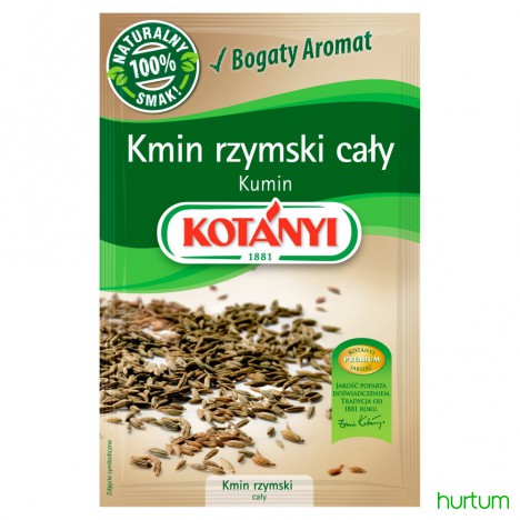 Kmin jest bardzo aromatyczną i pikantną przyprawą. Posiada delikatnie gorzki smak, który idealnie komponuje się z daniami kuchni indyjskiej. Kmin rzymski Kotányi cały lub rozdrobniony w moździerzu to niezwykła przyprawa nadająca potrawom niepowtarzalny smak.