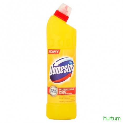 Domestos Przedłużona Moc* Citrus Fresh zagęszczony płyn czyszcząco-dezynfekujący. Powoduje poważne oparzenia skóry oraz uszkodzenia oczu. Działa bardzo toksycznie na organizmy wodne. Może powodować korozję metali. Uwaga! Nie stosować razem z innymi produktami. Mozę wydzielać niebezpieczne gazy (chlor). Chronić przed dziećmi. Przechowywać wyłącznie w oryginalnym pojemniku. Unikać uwolnienia do środowiska. Stosować rękawice ochronne/odzież ochronną/ochronę oczu/ochronę twarzy. W PRZYPADKU KONTAKTU ZE SKÓRĄ (lub z włosami): Natychmiast zdjąć całą zanieczyszczoną odzież. Spłukać skórę pod strumieniem wody/prysznicem. W PRZYPADKU DOSTANIA SIĘ DO OCZU: Ostrożnie płukać woda przed kilka minut. Wyjąć soczewki kontaktowe, jeżeli są i można je łatwo usunąć. Nadal płukać. Natychmiast skontaktować się z OŚRODKIEM ZATRUĆ/lekarzem. Zebrać wyciek. Zwartość/pojemnik usuwać do miejsc zgodnie z wymogami władz lokalnych. ZAWIERA: chloran(I) sodu, N-tlenki kokosoalkilo(dimetylo)amin, wodorotlenek sodu.