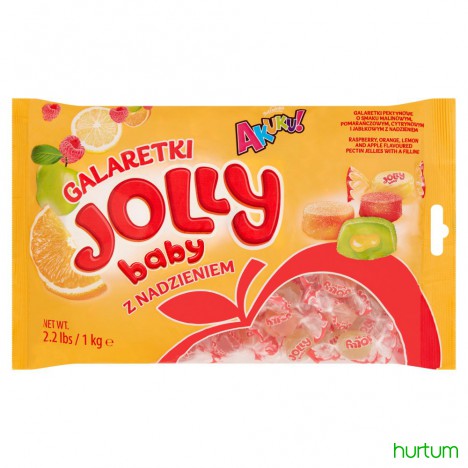 Galaretki pektynowe o smaku malinowym, pomarańczowym, cytrynowym i jabłkowym z nadzieniem (10%) w cukrze (7%).