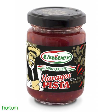 Flagowy produkt węgierskiego producenta Univer z Kecskemét. Przecier z ekstra ostrej świeżej papryki. Idealnie nadaje się do przyrządzenia zupy gulaszowej, porkolta, zupy rybnej oraz innych przypraw, które nie mogą się obejść bez wyjątkowego smaku ostrej papryki.Temperatura przechowywania: pomiędzy 0-(+20) °C Skład: Ekstra ostra świeżo mielona papryka przyprawowa (87%), sól spożywcza (średnio 11,5%), substancja zagęszczająca (guma ksantan), kwasek spożywczy (kwasek cytrynowy), konserwant (sorbinian potasu).Przydatność do spożycia: na opakowaniu Opakowanie: 150 g (słoik) Wartość odżywcza W 100 g produktu Kaloryczność 179 kJ (43 kcal) Białko 2,2 g Węglowodany 1,3 g Tłuszcze 2,0 g Nie zawiera substancji uczulających (bezglutenowy).