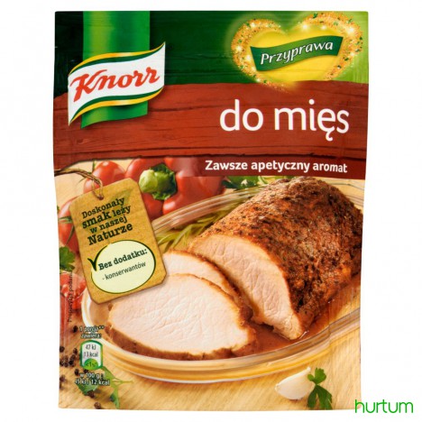 Przyprawa do mięs Knorr to aromatyczna kompozycja 8 suszonych ziół i przypraw, stworzona przez szefów kuchni Knorr. Stanowi doskonałe uzupełnienie każdego dania mięsnego, będąc gwarancją udanego obiadu. Dzięki przemyślanej kompozycji przyprawa dokładnie przywiera do powierzchni mięsa, jednocześnie nie spalając się podczas pieczenia czy smażenia. Przyprawa do mięs Knorr podkreśla smak potraw mięsnych i nadaje im apetyczny, rumiany kolor.