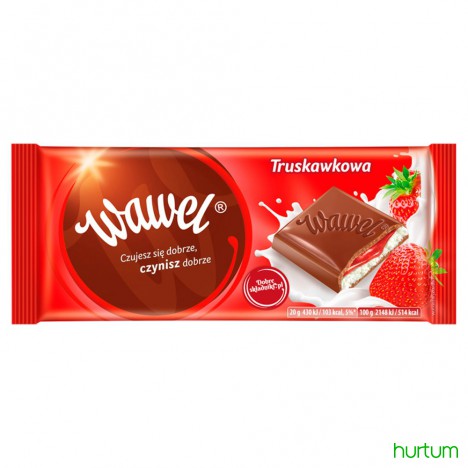 Czekolada mleczna z nadzieniem (48%) truskawkowo-jogurtowym.