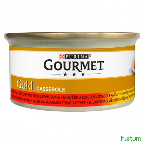 Nawet najbardziej wybredne z kotów będą zachwycone Gourmet Gold: menu wykwintnych dań, które różnorodnością tekstur i smaków rozpieszczają wyrafinowane podniebienia każdego dnia. Właśnie dlatego stworzyliśmy Gourmet Gold Casserole - smakowite kąski mięsne lub rybne, powoli gotowane w soczystym i wyrafinowanym sosie.. Czego mógłby chcieć więcej?