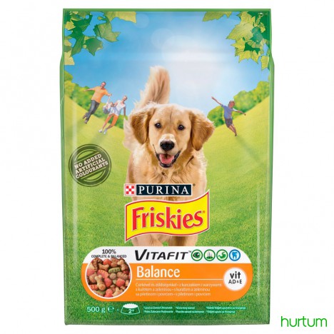 Purina Friskies Vitafit Balance to smaczna karma z kurczakiem i warzywami, połączona z pełnymi ziarnami, witaminami z grupy B oraz kwasami tłuszczowymi Omega 3 i 6. Friskies Balance jest źródłem wysokiej jakości białka i wszystkich innych składników odżywczych, których Twój pies potrzebuje do zdrowego i szczęśliwego życia.