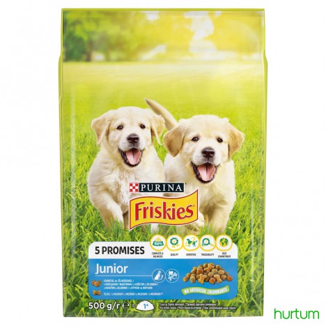 Friskies Junior to w 100 % zbilansowana i pełnoporcjowa karma, z dodatkową porcją białka i odpowiednim poziomem witamin, potrzebnych szczeniętom, aby wspierać ich wzrost i chęć zabawy.