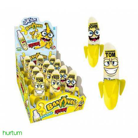 Duży spray w kształcie banana. Produkt nie zawiera żadnych barwników. Aromaty są tylko naturalne. Spray wysokiej jakości. Smak banana. Wymiary banana: długość: 12 cm szerokość: 5 cm (ze skórką). Masa netto 1 sztuki 25 g. Opakowanie display 12 sztuk.