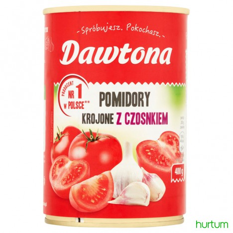 Pomidory krojone bez skórki z czosnkiem w soku pomidorowym. Produkt pasteryzowany.