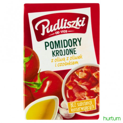 Pomidory krojone z oliwą z oliwek i czosnkiem. Produkt pasteryzowany.