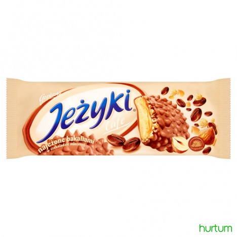 Herbatniki z karmelem o smaku kawowym 35,5%, chrupkami ryżowymi i orzechami laskowymi w czekoladzie mlecznej.