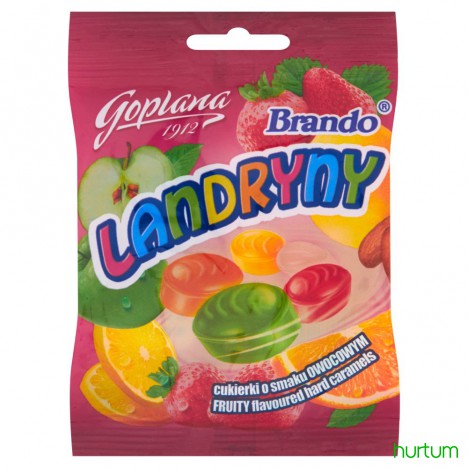 Karmelki twarde o smaku owocowym i migdałowym.