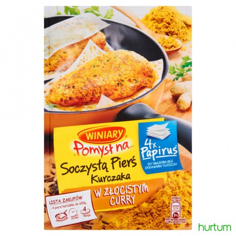 Winiary Papirus Pomysł na... to specjalny pergamin do smażenia pokryty unikalną kompozycją ziół i przypraw. I odrobiną tłuszczu. Dzięki niemu łatwo przygotujesz soczystą i aromatyczną pierś kurczaka, już bez dodawania tłuszczu podczas smażenia, który należy ograniczać w codziennej diecie. Proponowany przez nas sposób przygotowania sprawia, że danie jest wyjątkowo smaczne i aromatyczne, a mięso zachowuje soczystość.