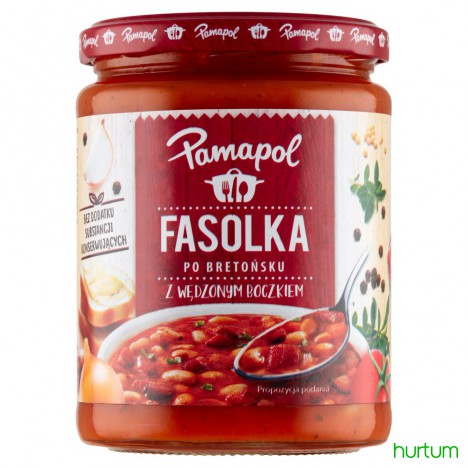 Fasola biała z boczkiem wieprzowym wędzonym, parzonym w sosie pomidorowym. Produkt sterylizowany.