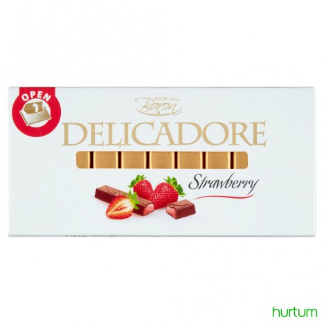 Czekolada mleczna z nadzieniem (50%) o smaku truskawkowym.