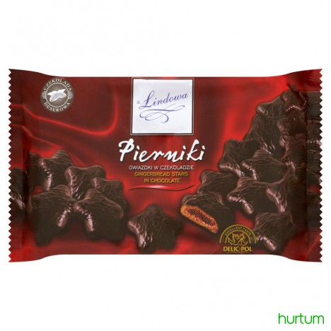 Piernik gwiazdka z nadzieniem o smaku truskawkowym w czekoladzie.
