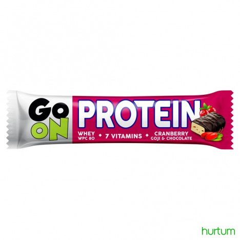 Proteinowy baton z żurawiną i jagodami goji w czekoladzie deserowej, wzbogacony witaminami.
