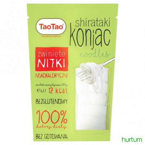 Shirataki konjac noodles w postaci atrakcyjnie zwiniętych nitek to produkt o wielu zaletach. Jest bezglutenowy, ma niską zawartość kalorii. Może być używany jako składnik niskotłuszczowej, niskokalorycznej i bezglutenowej diety. Ma neutralny smak i półprzezroczysty kolor, jest bardzo łatwy w przygotowaniu - można spożywać go jako zamiennik klasycznego ryżu lub makaronu, na ciepło lub zimno, jako dodatek do sałatek, dań z patelni, dań z warzywami, owocami, mięsem, nasionami lub kiełkami.
