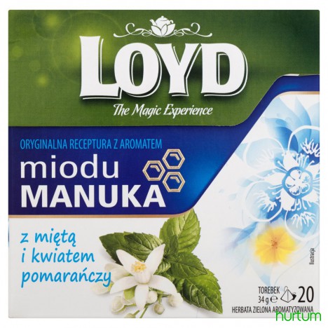 Herbata zielona z miętą i kwiatem pomarańczy w torebkach do zaparzania. Oryginalna receptura z aromatem miodu Manuka.