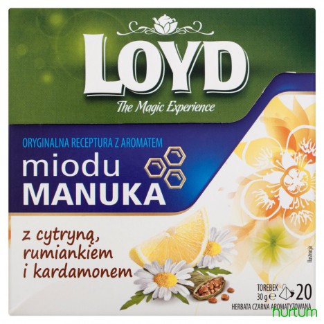 Herbata czarna aromatyzowana z cytryną, rumiankiem i kardamonem w torebkach do zaparzania. Oryginalna receptura z aromatem miodu Manuka.