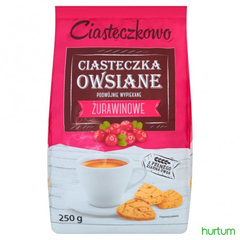 To podwójnie wypiekane ciasteczka owsiane z pełnego ziarna zbóż, które jest źródłem składników odżywczych. Ciasteczka owsiane żurawinowe są źródłem węglowodanów i błonnika. Dzięki specjalnej technologii produkcji odznaczają się wyjątkową kruchością i żurawinowym smakiem. To pyszna przekąska i znakomita alternatywa dla tradycyjnych słodyczy. Doskonałe jako ozdoba deserów i składnik łatwych do wykonania ciast. Ciasteczka owsiane żurawinowe wspaniale smakują z aromatyczną kawą, gorącym kakao czy popołudniową herbatą.