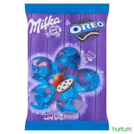 Jajeczka z czekolady mlecznej z mleka alpejskiego z mleczno-kremowym nadzieniem (38%) oraz pokruszone ciastka kakaowe (2%).