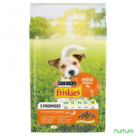 Purina Friskies Mini Menu to pyszny posiłek opracowany specjalnie dla Twojego małego psa, z mniejszymi granulkami. To w 100 % pełnoporcjowa i zbilansowana karma stworzona z wysokiej jakości składników i włókien dla zdrowego trawienia.