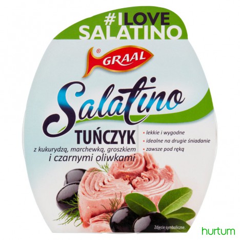 Sałatka z tuńczykiem, kukurydzą, marchewką, groszkiem i czarnymi oliwkami. Konserwa rybna sterylizowana.