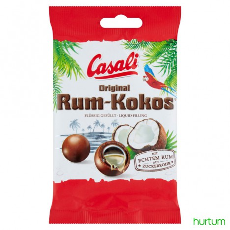 Draże kokosowe z płynnym nadzieniem (10%) z dodatkiem rumu, z ciemną czekoladą (9%), w polewie z mlecznej czekolady (59%).