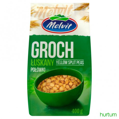 Składniki: 2 litry wywaru warzywnego, 2 szklanki grochu Melvit, 25 dag boczku wędzonego, 2 cebule, 4 ząbki czosnku, 1 łyżeczka majeranku, 1 łyżeczka cząbru, 25 dag kiełbasy cienkiej, listki laurowe i ziele angielskie.