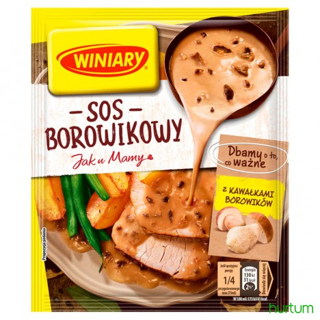Sos Borowikowy Jak u Mamy Winiary to niezwykle intensywny sos o aksamitnej konsystencji, który nada głębokiego smaku Twoim daniom. Jest niezastąpiony w przygotowaniu dań mięsnych, takich jak: bitki, zrazy czy roladki.