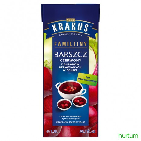 A barszcz Krakus - na zagęszczonym soku z buraków, bez konserwantów - to wyborna zupa, na którą zasługujesz nie tylko od święta. Dzięki sprawdzonemu od lat przepisowi, barszcz Krakus zachwyca doskonałym smakiem, wyrazistym i zarazem delikatnym. Możesz podać go tradycyjnie, z uszkami lub pasztecikami. Zupę podawaj w wielkiej, rodzinnej wazie... Bo porcja familijna barszczu Krakus jest w sam raz, gdy przygotowujesz uroczysty obiad dla swojej rodziny.