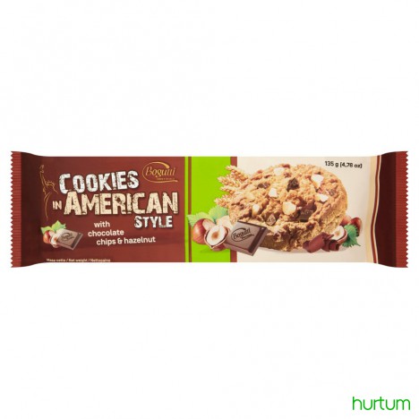 American Cookies z czekoladą 10% i orzechami laskowymi 5%. Kruche ciasteczka z kropelkami czekolady 10% i orzechami laskowymi 5%.