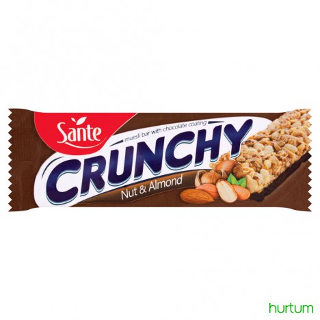 Baton zbożowy musli z orzechami i migdałami podlany czekoladą.