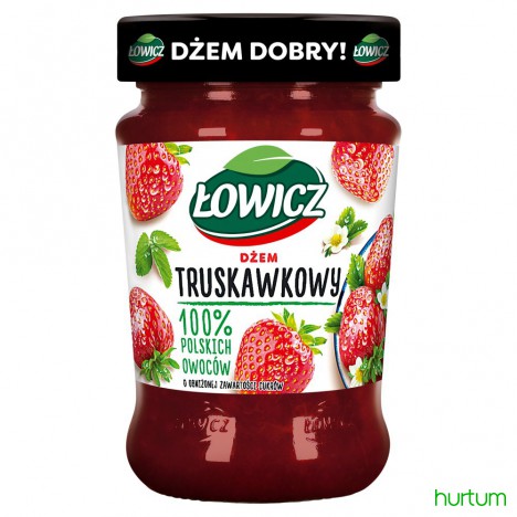 Dżem truskawkowy o obniżonej zawartości cukrów.* Pasteryzowany.