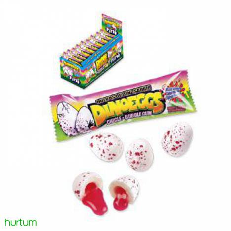 Guma balonowa w kształcie jaja dinozaura, wypełniona owocowym sokiem. Każda pakowana osobno. Opakowanie zbiorcze 200 szt. Waga netto 1 sztuki: 5 g.