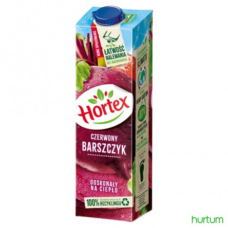 Barszczyk Czerwony Hortex - o pięknej, głębokiej barwie i harmonijnym smaku przygotowany jest z naturalnego soku z buraków z dodatkiem soku jabłkowego, który podkreśla jego smak i dodaje naturalnej słodyczy. Świetny do spożycia zarówno na zimno jak i podgrzany.