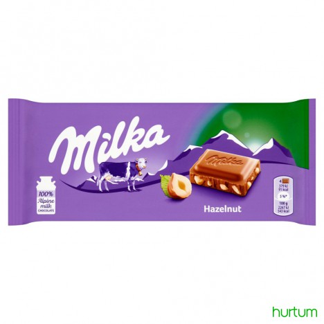 Czekolada mleczna z mleka alpejskiego z kawałkami orzechów laskowych.