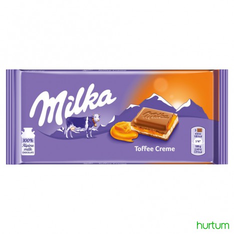 Czekolada mleczna z mleka alpejskiego z nadzieniem mlecznym o smaku toffi (35%) i nadzieniem toffi (15%).