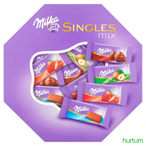 Mieszanka czekoladek mlecznych z mleka alpejskiego, czekoladek mlecznych z mleka alpejskiego z nadzieniem kakaowym, czekoladek mlecznych z mleka alpejskiego z nadzieniem o smaku truskawkowym i czekoladek mlecznych z mleka alpejskiego z kawałkami orzechów laskowych.