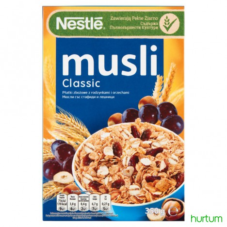 Nestlé Musli Classic to pyszne połączenie pełnoziarnistych płatków z rodzynkami i orzechami