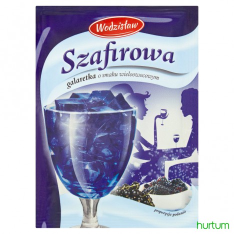 Przepiękny kolor galaretki szafirowej doskonale komponuje się z delikatnym smakiem wieloowocowym o nucie jeżynowo-śliwkowej. Ta niezwykła mieszanka koloru i smaku sprawi, iż dowolny deser zachwyci zarówno domowników jak i gości. Składniki: cukier, żelatyna wieprzowa, regulator kwasowości: kwas cytrynowy; aromat, barwnik: czerń brylantowa BN. Produkt może zawierać gluten, mleko i seler. Wartość odżywcza produktu w 100 g: wartość energetyczna 213kJ/50kcal; Tłuszcz 0g w tym kwasy tłuszczowe nasycone 0g, Węglowodany 11g w tym cukry 11g; Białko 1,5g; Sól 0g. Przechowywać w suchym i chłodnym miejscu. W przypadku użycia świeżych owoców kiwi i ananasa – galaretka nie tężeje. Galaretkę można podawać z owocami, kremami, bitą śmietaną lub używać do dekoracji ciast i tortów