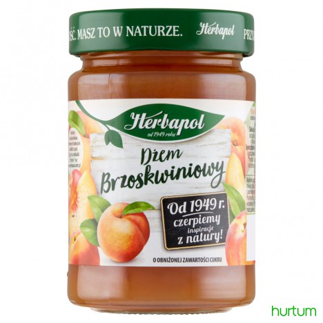 Dżem brzoskwiniowy o obniżonej zawartości cukru.* Pasteryzowany.