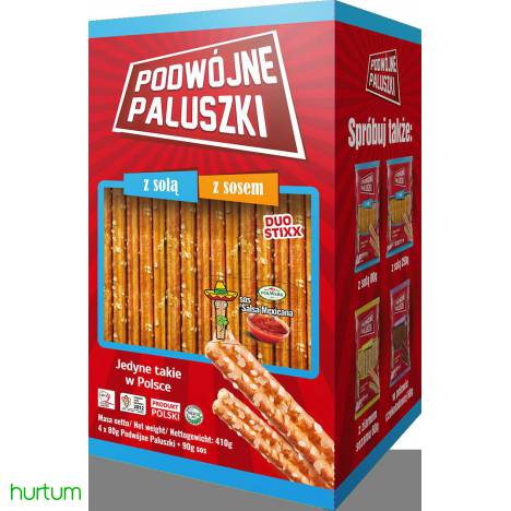 Produkt idealny na imprezy, można go zabrać wszędzie ze sobą. Podwójny Paluszek spełnia funkcję "łyżeczki" i można nabrać solidną porcję sosu i cieszyć się wyjątkowym smakiem słonych paluszków razem z ostrym sosem Salsa Mexicana.