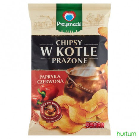 Chipsy z ziemniaków krojonych ze skórką, smażone, o smaku paprykowym.