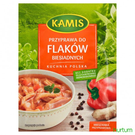 Składniki (dla 4-6 osób): 250 g szpondra wołowego, 1/2 pęczka włoszczyzny, 1 mała cebula, 500 g pokrojonych obgotowanych flaków, 2 łyżki masła, 1/2 łyżki mąki, produkty Kamis: 1 opakowanie Przyprawy do flaków biesiadnych, 2-3 Liście laurowe, 3 ziarna Ziela angielskiego.