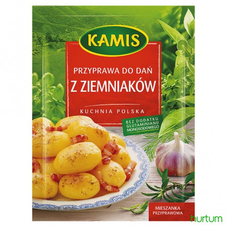 Składniki (dla 4 osób): 1,5 kg młodych ziemniaków, 150 g boczku wędzonego, 1 cebula, olej, 3 łyżki Przyprawy do dań z ziemniaków Kamis.