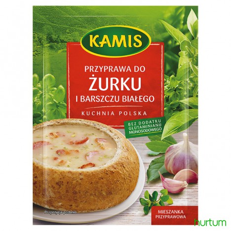Składniki (dla 4 osób): 150 g boczku wędzonego, 150 g kiełbasy wędzonej lub białej, 1 szklanka zakwasu, 1 łyżka mąki pszennej, 2 łyżki chrzanu, 3 łyżki śmietany 18%, 1 opakowanie Przyprawy do żurku i barszczu białego Kamis.