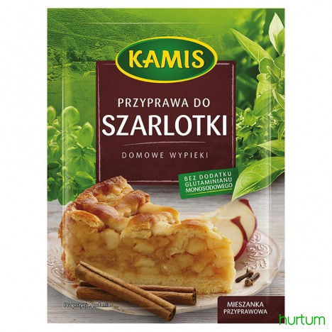 Składniki: 450 g mąki, 300 g masła, 150 g cukru pudru, 2 żółtka, szczypta soli, 1,5 kg kwaśnych jabłek, 150-200 g cukru, 80 g rodzynek, 1 łyżka tartej bułki, masło i mąka do formy, cukier puder do posypania, 1/2 łyżki Przyprawy do szarlotki Kamis.