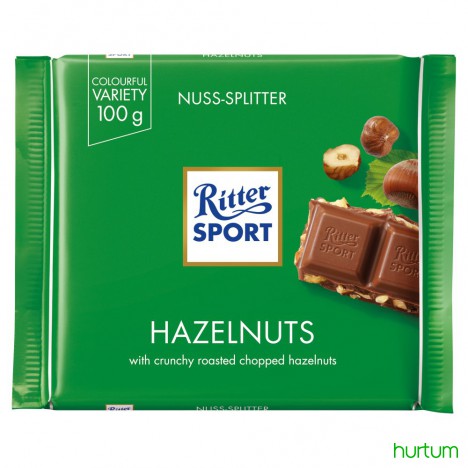 Czekolada mleczna z kawałkami prażonych orzechów laskowych (12%).